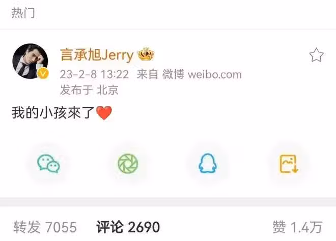 2月8日,46歲一直單身未婚的言承旭突然發文:「我的小孩來了!」瞬間引起網友們熱議。