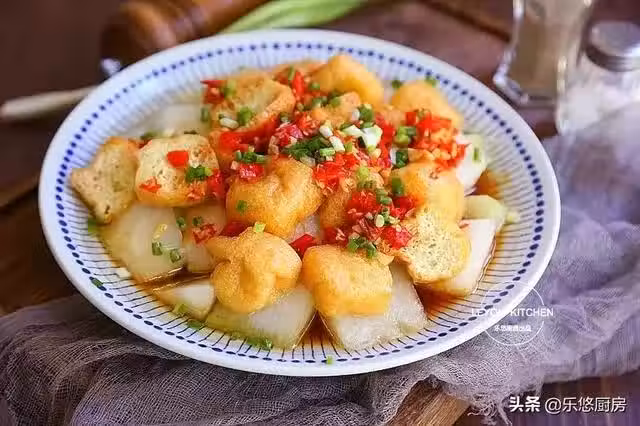 第四步:取一個大盤子,把冬瓜放在下面,油豆泡放在上面,如圖。