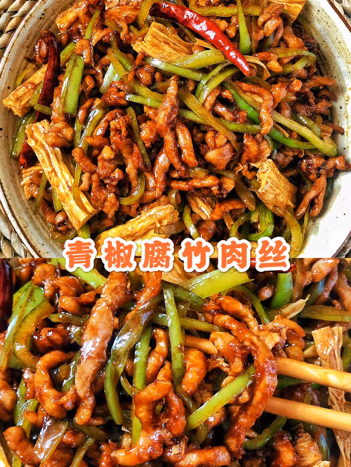 今天帶給大家一個青椒腐竹肉絲,香辣嫩滑,超下飯巨好吃的家常快手菜,三碗米飯不夠吃