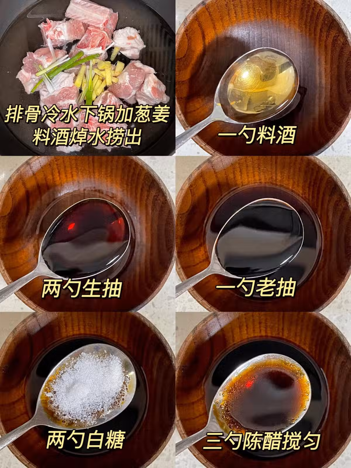 食材:排骨,蔥姜,料酒,生抽,老抽,白糖,陳醋,冰糖,白芝麻