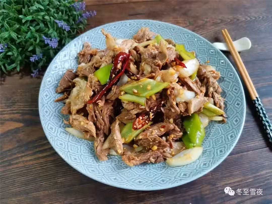 8.把撕好的肉條和尖椒塊,洋蔥塊,放入大碗內,淋入調好的涼拌汁,用筷子翻拌均勻,盛出裝盤即可,一盤味道香濃不膩,好吃下飯的涼拌拆骨肉就做好了。