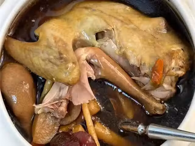 食材:黨參一根、黃芪8片、紅棗、烏雞白鳳丸1枚、紅棗5個、枸杞少量、鴿子一個(不用焯水)