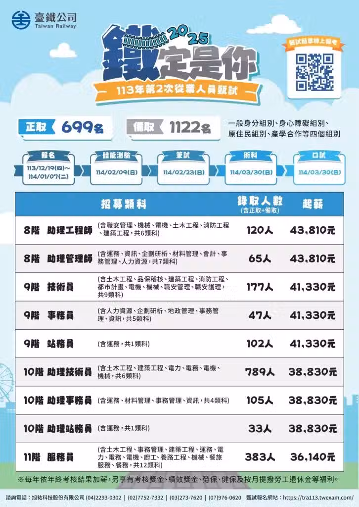 技術員、事務員、站務員:錄取114名,甄試類科包含土木工程、建築工程、消防工程、都市計劃、機械、電機、職安管理、職安護理、品保稽核、資訊、企劃研析、事務管理、地政管理、人力資源及運務等15項。