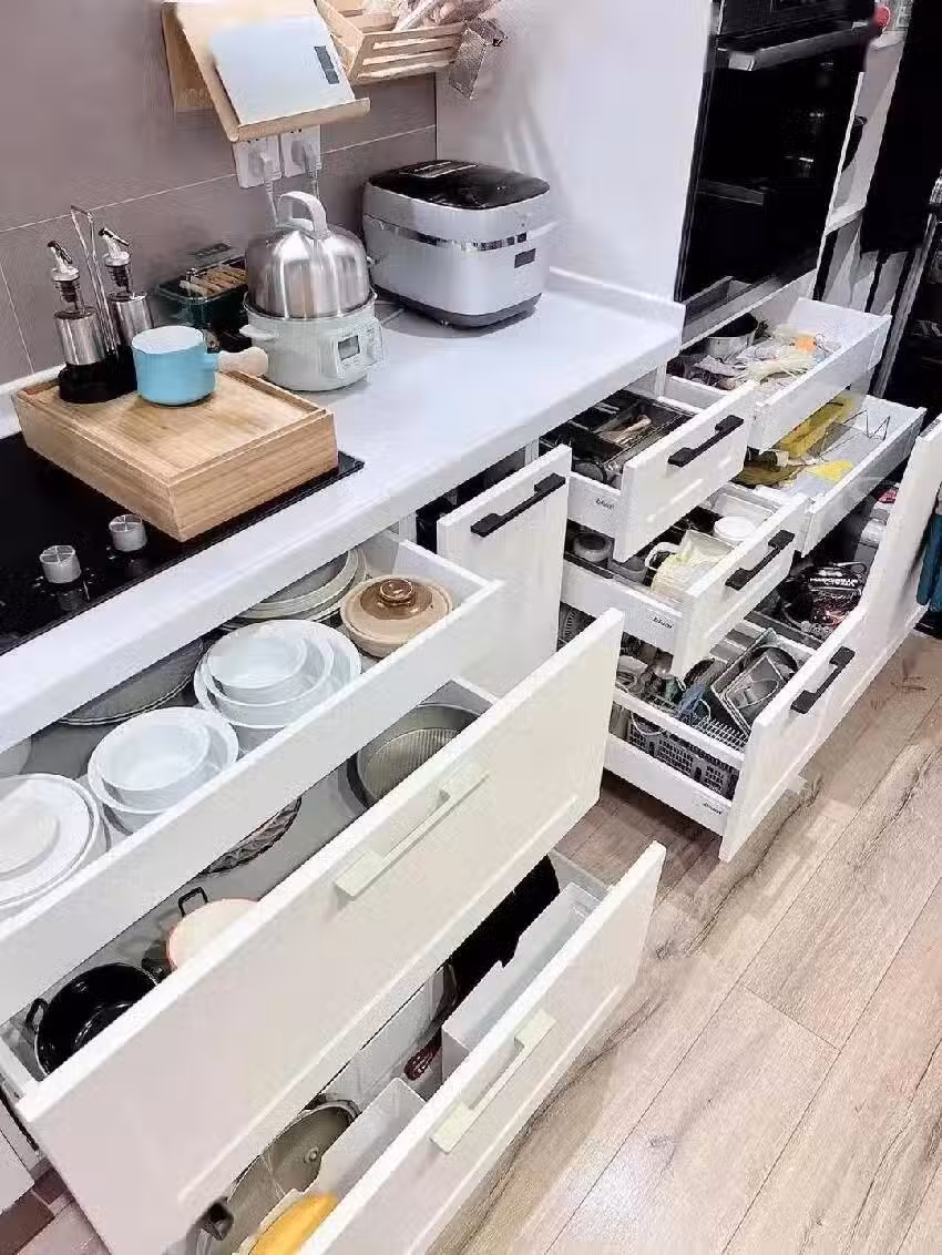 所以,建議層板櫃只保留1-2個,用於存儲米、面、油之類的大件,其他改做抽屜櫃,更利於收納和拿取。