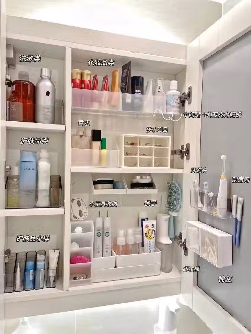 比如添置各種大不一的收納盒,用於收納洗漱品、化妝品、護膚品等等,這樣就能擺脫洗漱台堆物太亂的困擾。