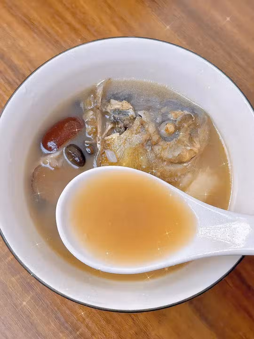 3、把鯽魚湯倒進黑豆湯,小火再煲半小時調味即可。
