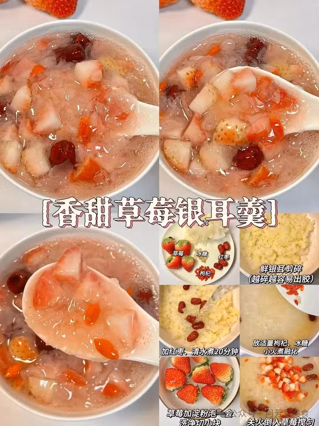 冬季就適合吃草莓,那麼這款草莓銀耳羹就非常適合了。草莓酸酸甜甜的搭配銀耳,不僅不會很甜也不會感覺到膩。