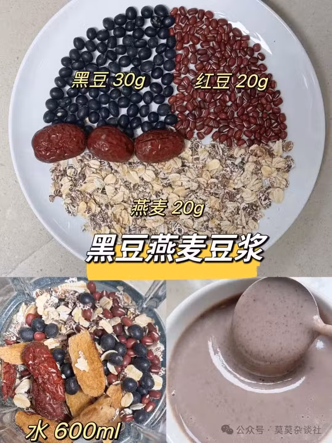 味道與功效:豆香混合著燕麥的麥香,喝起來暖胃又滋潤。黑豆補腎,紅豆利水消腫,燕麥降脂護心,紅棗補血安神,這款豆漿特別適合經常熬夜、壓力大的人。