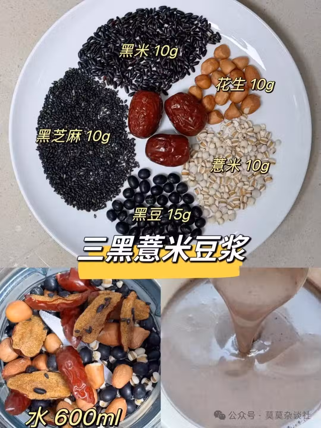 味道與功效:這款豆漿口感豐富,有淡淡的穀物香氣。薏米健脾祛濕,黑豆補腎,黑米補血益氣,花生滋補潤燥,黑芝麻養發護膚,紅棗又添一筆甜美——真是一杯會「呵護」的豆漿!