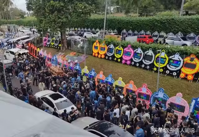 追悼會現場,有好幾輛非常顯目的「靈車」,上面印有統一的文字「一代梟雄」,周圍則布滿了有燈牌的花圈,算下來少說也得有幾千個,靈堂內的陣容也是空前絕後,除了醒目的五色之外,還有多個孝獅的獅頭。