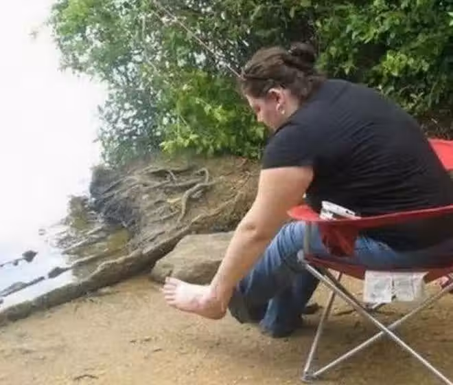 從照片里的角度看去,坐在河邊的婦女想是一位變異人似的。因為她的胳膊和腳好像給長在了一起,看起來非常可怕,但如果細看一下就會明白,這也是一張非常有趣的錯位照片。