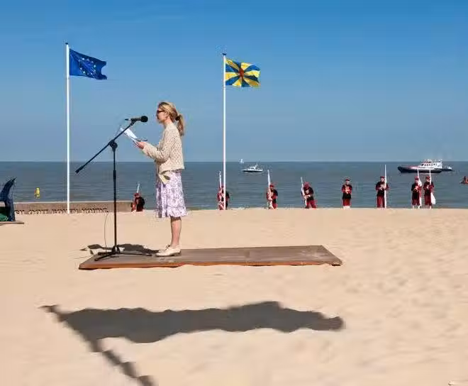 一位女士站在一塊木板上演講,木板在沙地上,而一塊旗幟的倒影剛好在木板的下方。遠遠看去還以為女孩踏在飄在空中的飛毯上呢!