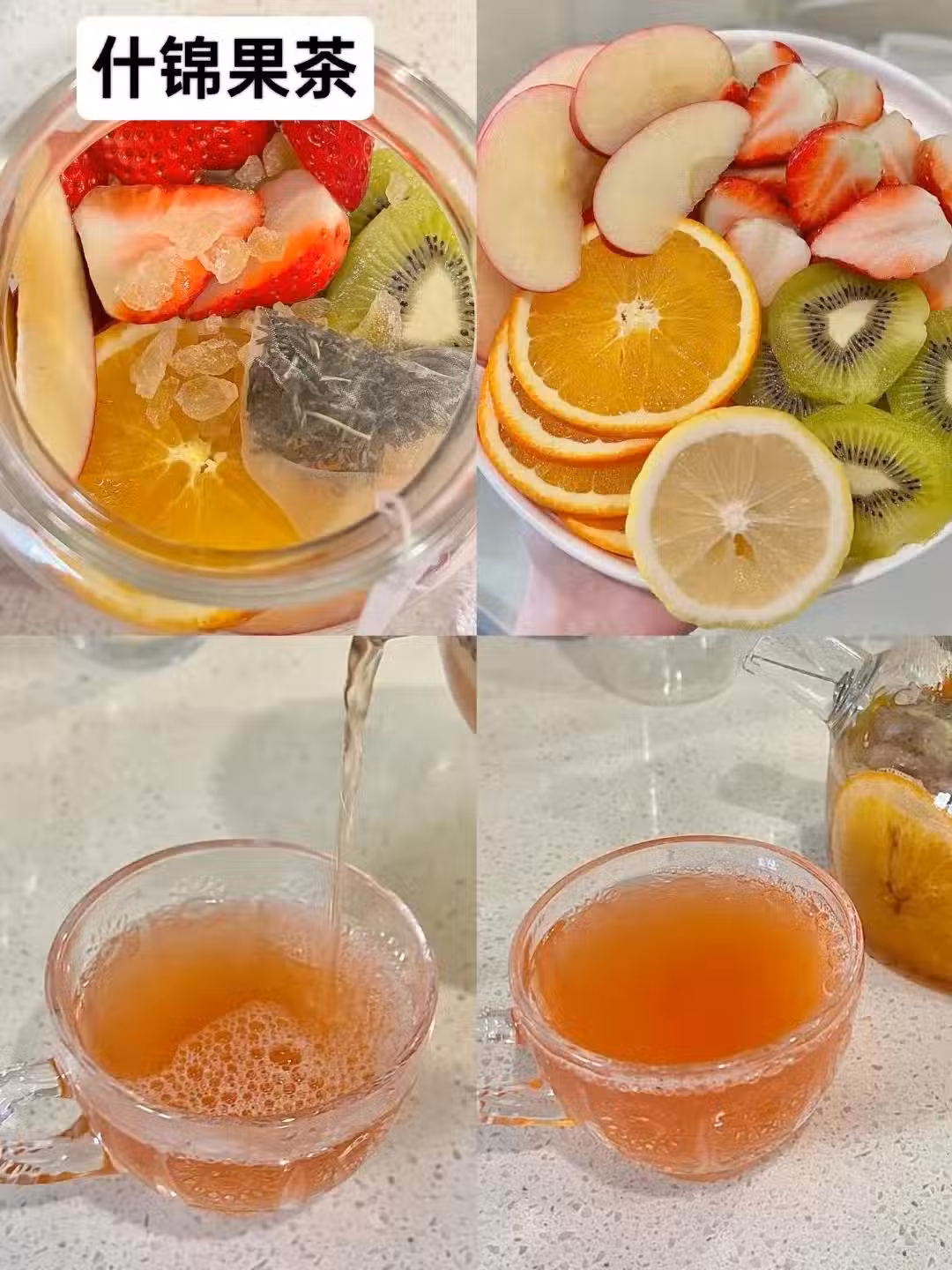 橙子半個、蘋果半個、草莓8-10顆、獼猴桃1個、檸檬半個、茉莉綠茶包、黃冰糖適量