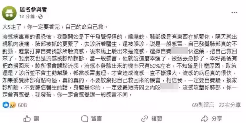大S染流感猝逝!他曝經驗「肺部被抓緊」病程快:一定要去驗