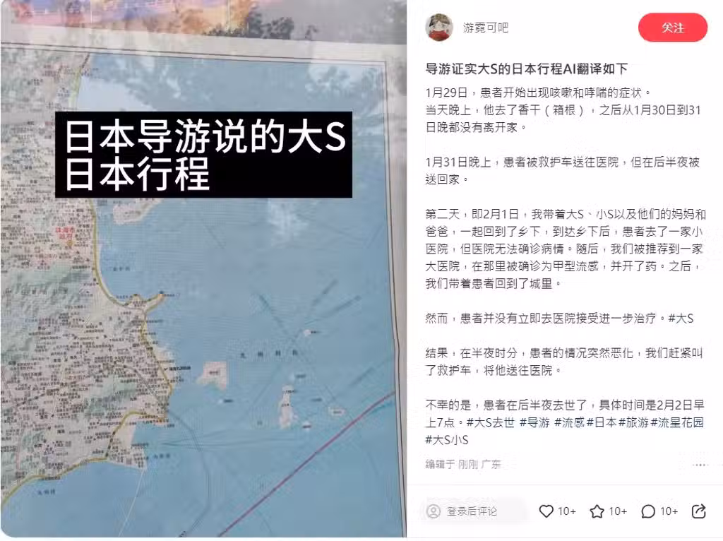 但某導遊表示其實大S發現感冒的時間是1月29日,抵達旅行地之後她在酒店裡休息了兩天,而搶救的黃金48小時就這樣子被耽誤了。