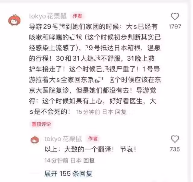 按這名導遊的說法,大S 30、31號兩天都沒有出屋,31號晚上打了救護車電話,到後半夜就又送回來了。