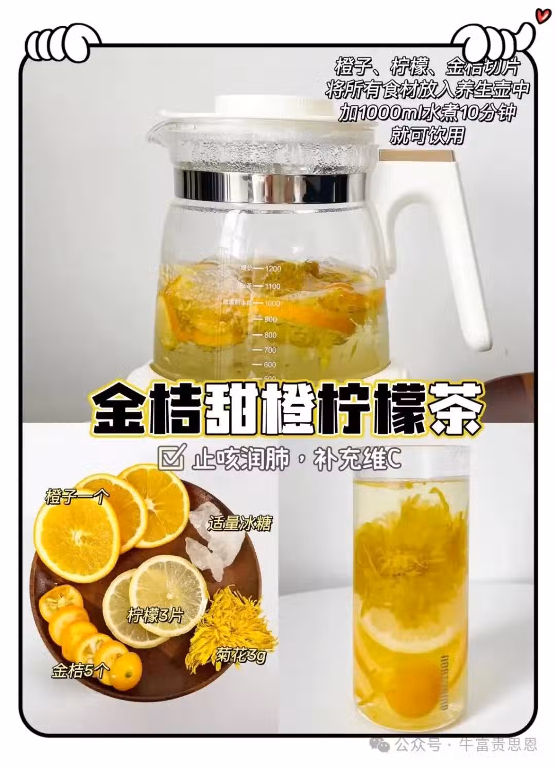 金桔富含維生素C、金桔甙等成分,具有理氣解郁、止咳化痰、消食醒酒等功效;橙子同樣富含維生素C,能增強免疫力、開胃消食;檸檬富含檸檬酸、維生素C等,有生津止渴、開胃提神的作用;菊花可清肝明目、清熱解毒;冰糖能增加甜味,使口感更加宜人。