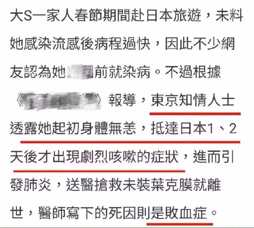 據媒體報道得知,東京那邊的知情人士透露,大S起初身體並無大礙,抵達日本1、2天後才出現劇烈咳嗽的症狀,進而引發肺炎,送醫院搶救未安裝葉克膜就離世了,醫生寫下的死因是敗血症。