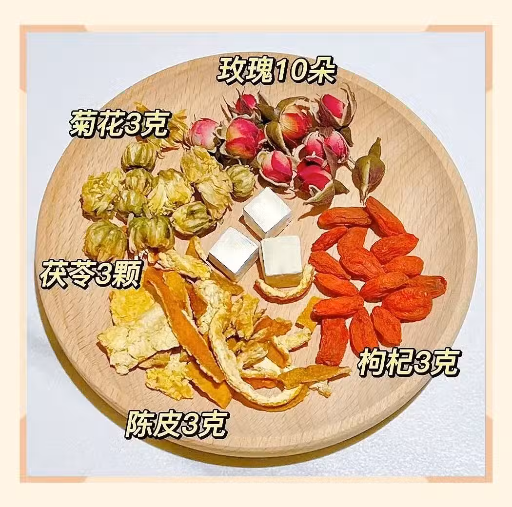 1. 菊花、玫瑰、茯苓、枸杞、陳皮用清水沖洗乾淨。
