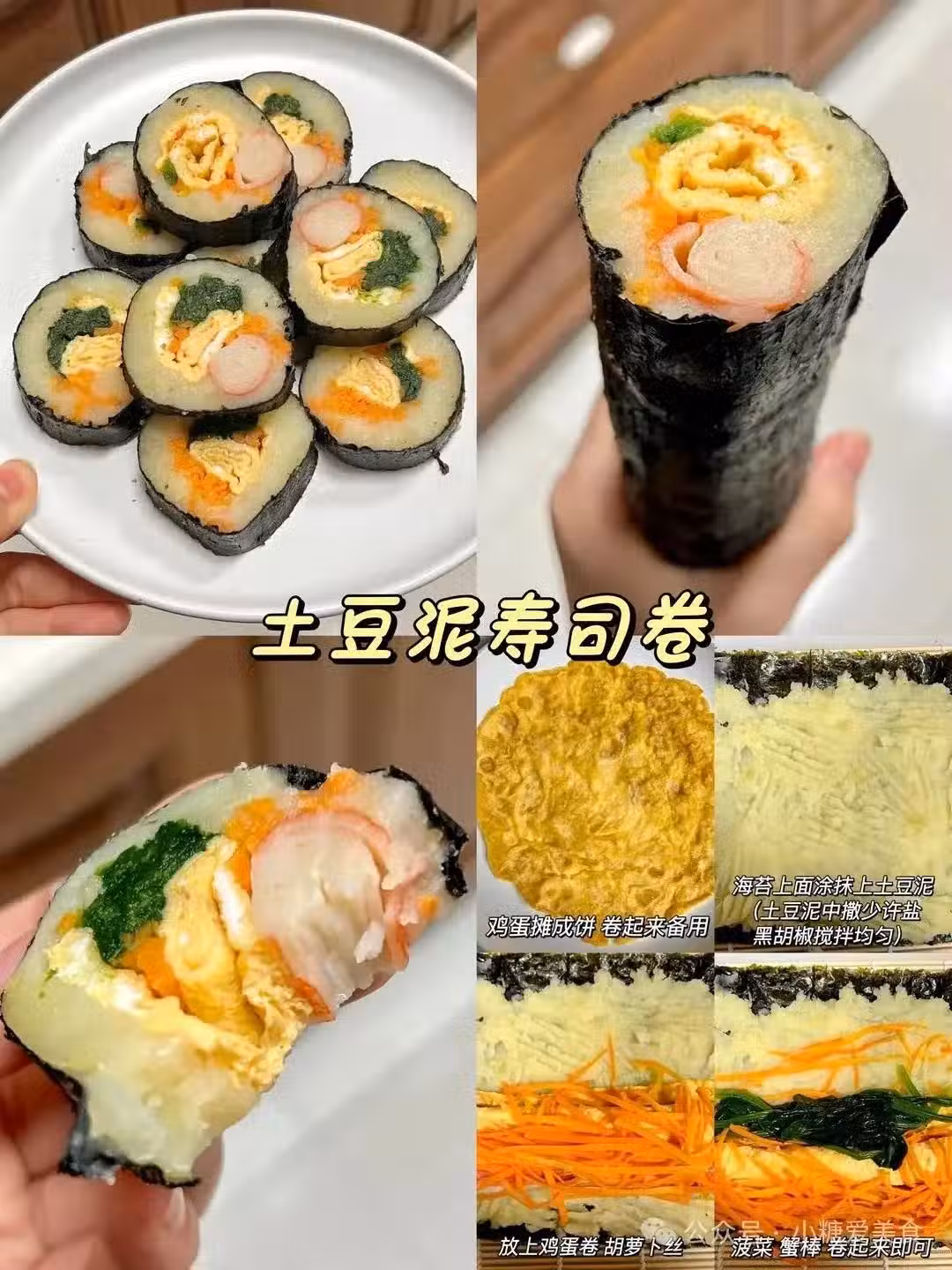東北老鐵看了沉默,俄羅斯大漢看了流淚。蒸熟的土豆碾壓成泥代替米飯,捲入雞蛋胡蘿蔔絲,口感綿密得像在吃雲吞餡兒——建議改名叫《碳水の套娃行為》。