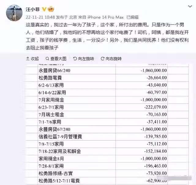 其實,汪每月給的撫養費只有20萬台幣,換算成人民幣不到4萬5。