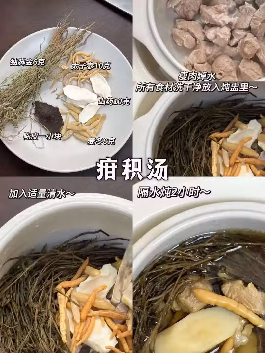 瘦肉焯水,接著加入獨腳金、太子參、山藥、陳皮、麥冬,洗凈後一起放燉盅。