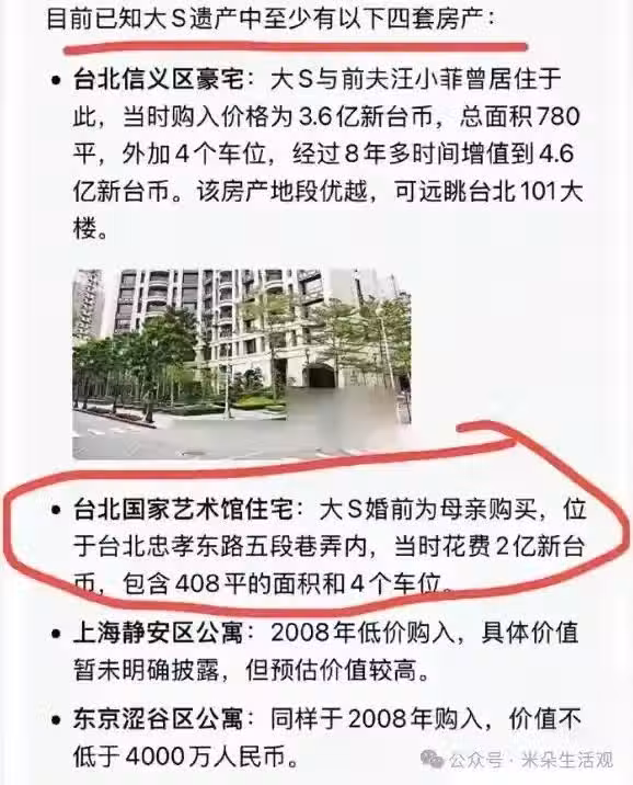 根據灣灣當地的法律,大S去世後,這些價值連城的房產大部分將歸她的兩個孩子所有。從這個角度來看,大S在生前似乎已經深思熟慮,精心布局,成功地為孩子保住了這些房產,讓黃春梅原本精心謀劃的算盤落了空。