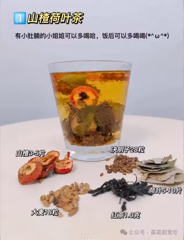 食材:山楂3-5片+荷葉5-10片+決明子28粒+大麥18粒+紅茶1.0g