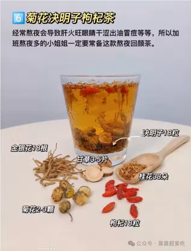 食材:菊花2-3顆+金銀花18根+決明子18粒+桂花38朵+枸杞18粒+甘草3-5片