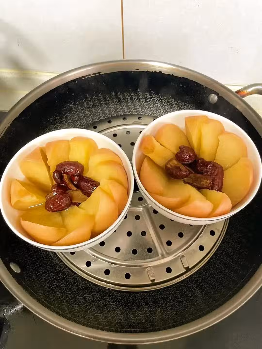 2、準備幾顆紅棗,把棗核去掉,放在碗中間位置。隨後,將碗放入蒸鍋中,待水燒開後,把火調至中小火,蒸上15分鐘。蒸好後別急著取出,讓它在鍋里再燜上幾分鐘。