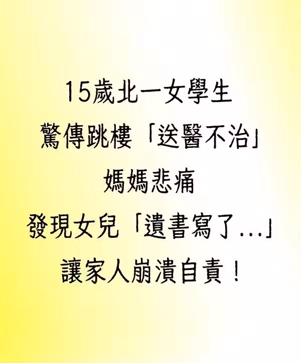 不過很遺憾的是女學生因多處骨折,傷重不治,讓媽媽無法接受這殘忍的事實,不斷的說「我女兒早上才說要去上學阿!怎麼會這樣...」,警方除了安慰家人節哀順變,但也需要調查女生墜樓是否有什麼原因存在,家人回想後表示,女兒的成績一直都很不錯,原本是想念師大附中,不想要進入北一女中這麼菁英輩出的學校,會有很大的壓力。