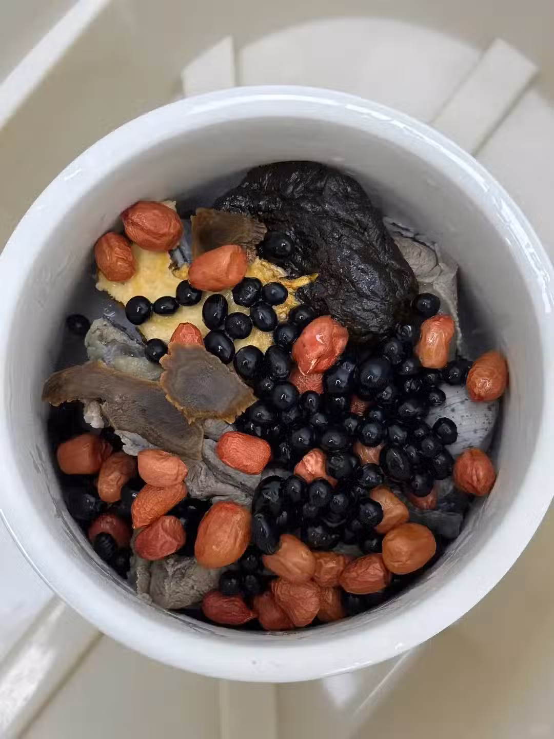 食材:黃精15克、黑豆15克、紅皮花生15克、當歸3克、枸杞適量、烏雞適量