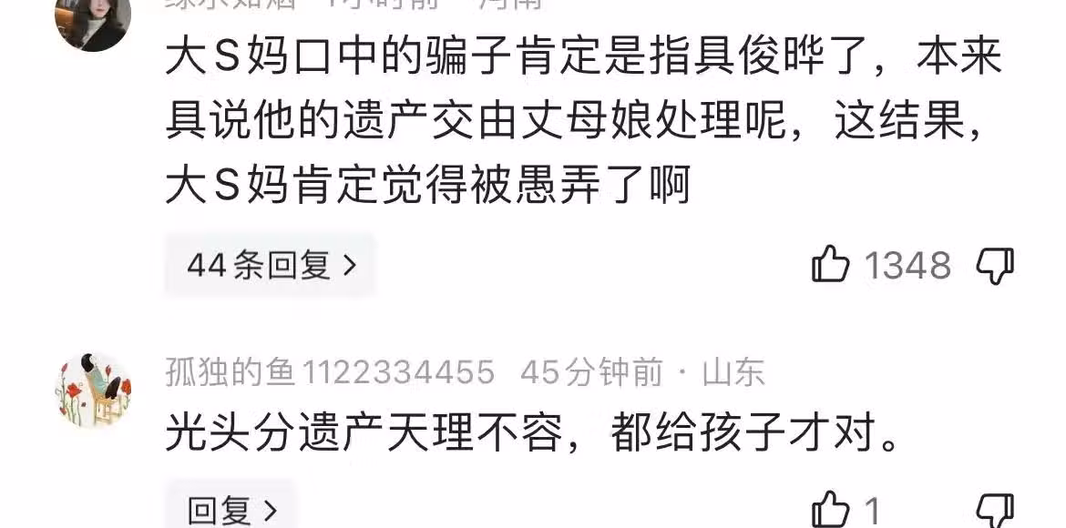 最大受益人是光頭,三年不勞而獲,分走了大S的財產三分之一。如果是離婚,具俊曄是分割不了,但遺產繼承就不是這個規定了,除非大S有遺囑。