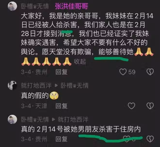 事實上,一名自稱是張洪佳哥哥的男子曾在3月表示,妹妹2月14日被殺死,家人2月28日才得知噩耗,到現在還不敢告訴長輩,兇手被逮捕後承認犯案,面對許多人排山倒海的質疑,他強調「我會亂說自己得妹妹嗎?」據悉,張洪佳的遺體是在男友家被發現的。