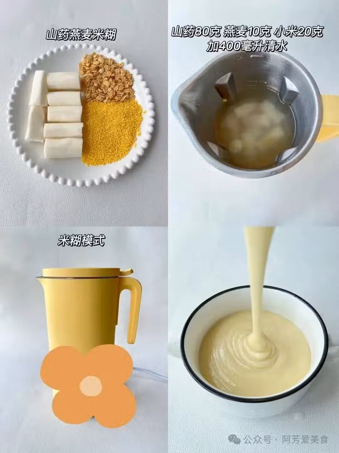 山藥燕麥米糊,山藥和小米打成米糊會變得非常的濃稠又淳香,再加入燕麥豐富了一整碗的口感,很是上頭。
