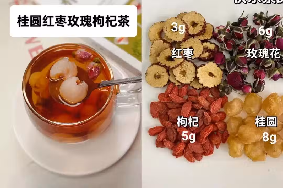 食材:干桂圓8g、玫瑰花6g、枸杞5g、紅棗3g(切片)