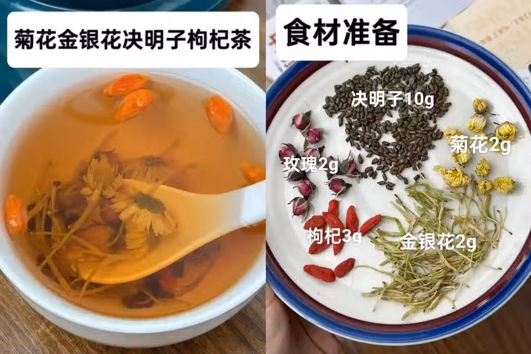 金銀花、菊花各2g、決明子10g、玫瑰2g、枸杞3g