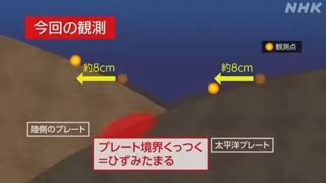 截至去年的海底地殼變動觀測結果顯示,千島海溝的海洋與大陸板塊緊密相連。(NHK報道圖片)