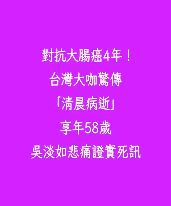 對抗大腸癌4年!台灣大咖「清晨病逝」享年58歲 吳淡如悲痛證實死訊!