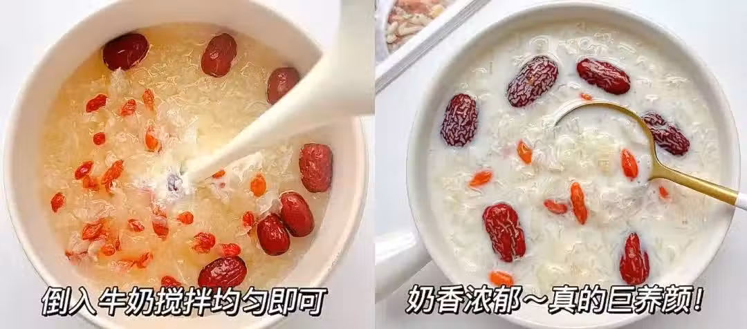 牛奶換成椰奶也是可以的,要是把銀耳換成燕窩,那效果更棒,所以喲,看你更喜歡哪一種風格。