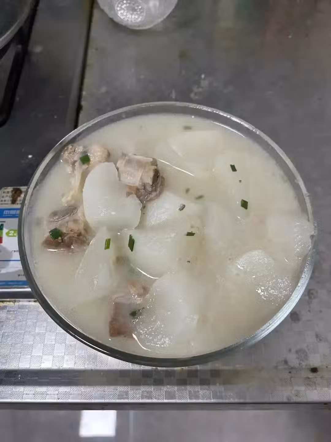 食材:排骨250g、白蘿蔔半根、蔥1段、姜3片、蒜3瓣、料酒1勺、鹽少許、熱水適量。