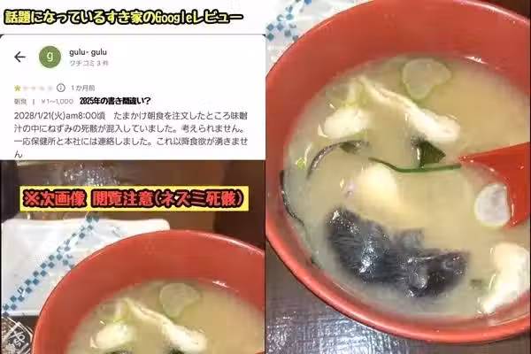 日本知名牛丼連鎖品牌「すき家」(Sukiya)近期捲入食安爭議,有網友爆料,鳥取一間分店的Google評論中,有顧客留言稱,在店內的味噌湯中發現「老鼠屍體」,並附上驚悚照片,震驚不少網友。