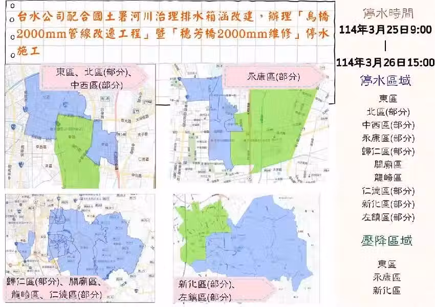 有關停水、供水站與相關問題,可撥打客服專線 1910或台南各區服務所:台南給水廠 、台南服務所、永康服務所、新市服務所、歸仁服務所,民眾亦可至台水停水公告網站查詢最新資訊。