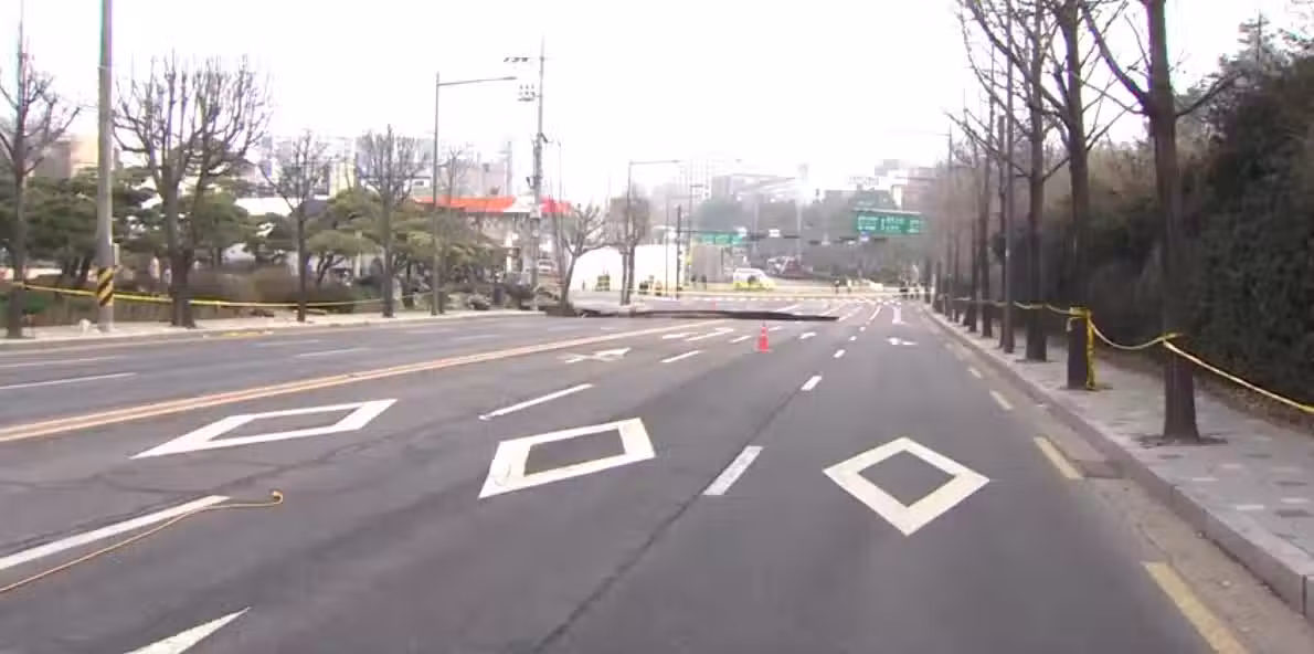 韓國首爾江東區一處路口昨天(24日)因路面塌陷,形成一個20米深巨坑(約6層樓),一輛摩托車閃避不及,連人帶車墜入深坑。