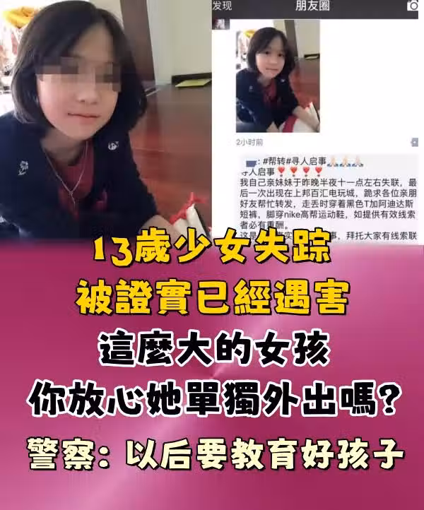 13歲少女失蹤被證實已經遇害,這麼大的女孩你放心她單獨外出嗎?警察:以後要教育好孩子