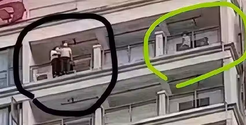 不知是誰最先發現異常,只見位於31樓的陽台上站立著兩個年輕人,他們的身形已經翻越欄杆,一副隨時掉落的樣子。