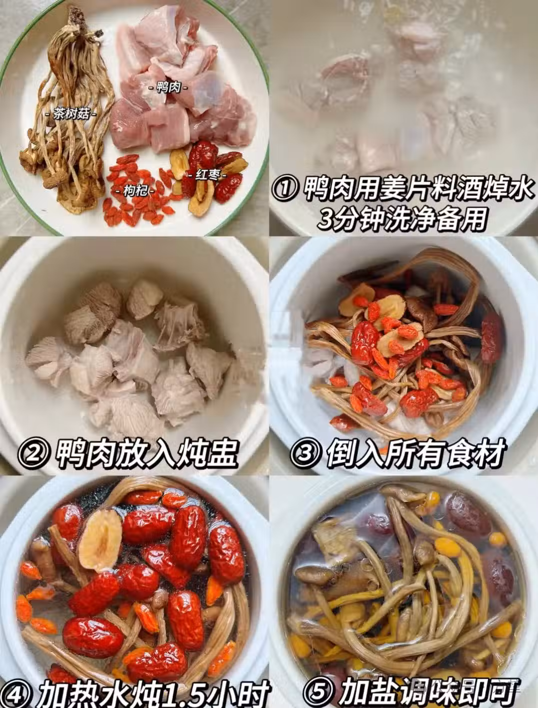 可以使用砂鍋或者湯鍋。將處理好的鴨塊放入煲湯容器中,加入適量的清水,水量要沒過鴨塊,一次性加足水。把茶樹菇、紅棗一起放入鍋中。蓋上鍋蓋,先用大火煮沸,然後轉小火慢煲。小火煲湯可以使鴨肉和茶樹菇的營養成分充分溶解在湯中,讓湯更加鮮美。煲湯時間一般為 1.5 - 2 小時左右。