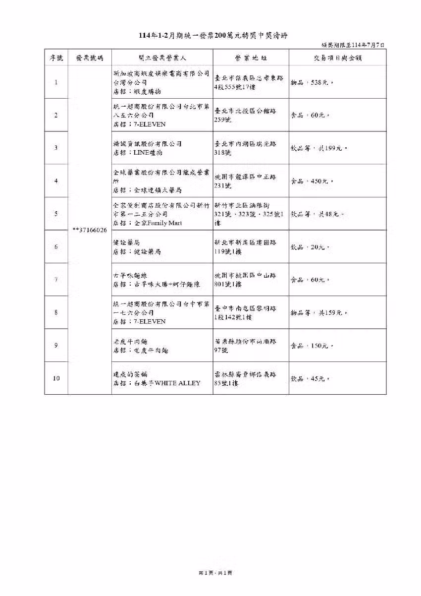 114年1-2月期統一發票200萬特獎中獎清冊。