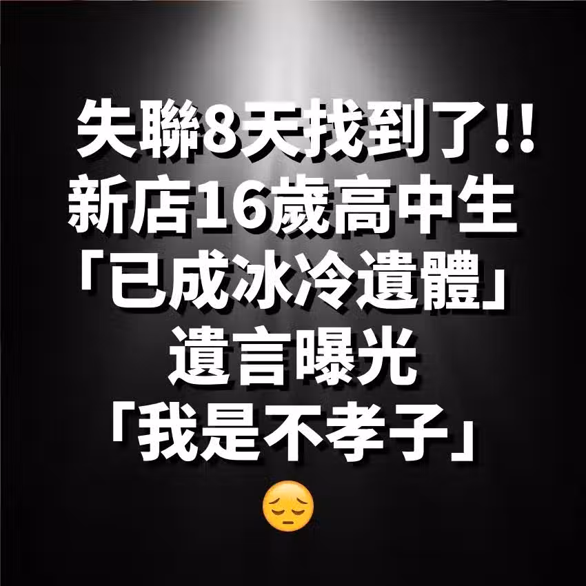 失聯8天找到了!新店16歲高中生「已成冰冷遺體」 遺言曝光「我是不孝子」