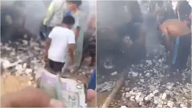 根據畫面,歹徒稍後抵達一座村莊,準備偷另一輛車,繼續逃逸。他們離開前,放火把作案廂型車燒了,還將其中一袋鈔票留在現場,疑似是為了誤導警方辦案。不過,隨著白花花的紙鈔撒滿地,居民紛紛衝上去撿拾,甚至有人在燃燒後的灰燼里不斷翻找,希望找到依然完整的紙鈔。